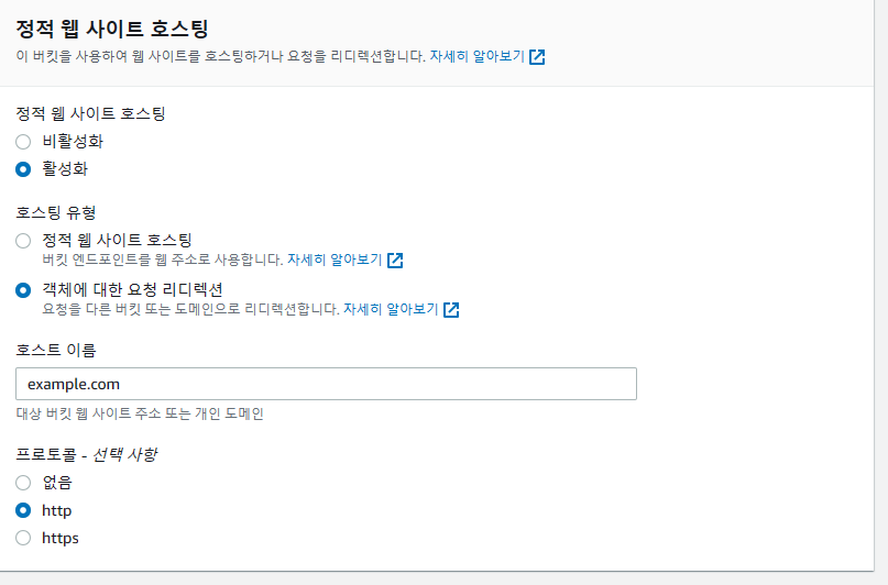 example.com 버킷에 속성으로 가서 제일 하단에 정적 웹사이트 호스팅을 활성화 한다.