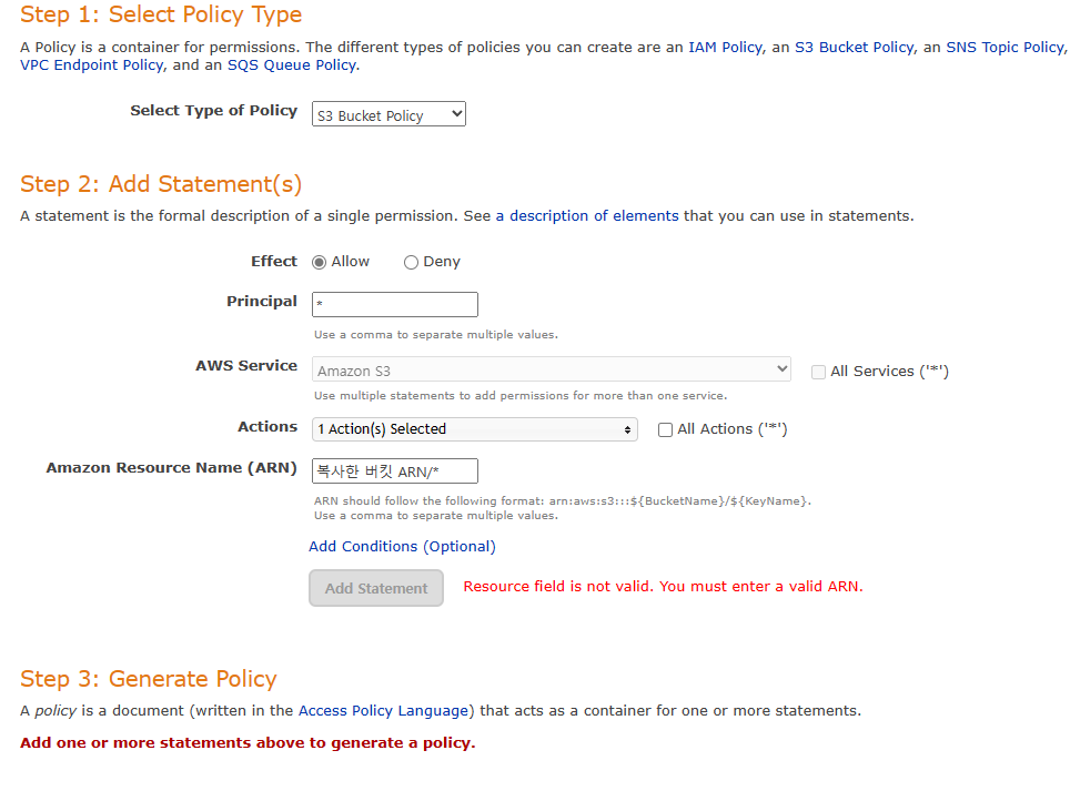 그후 Add Statement 버튼이 활성화 되면 클릭후 밑에 Generate Policy를 클릭해서 json 코드를 복사 후
