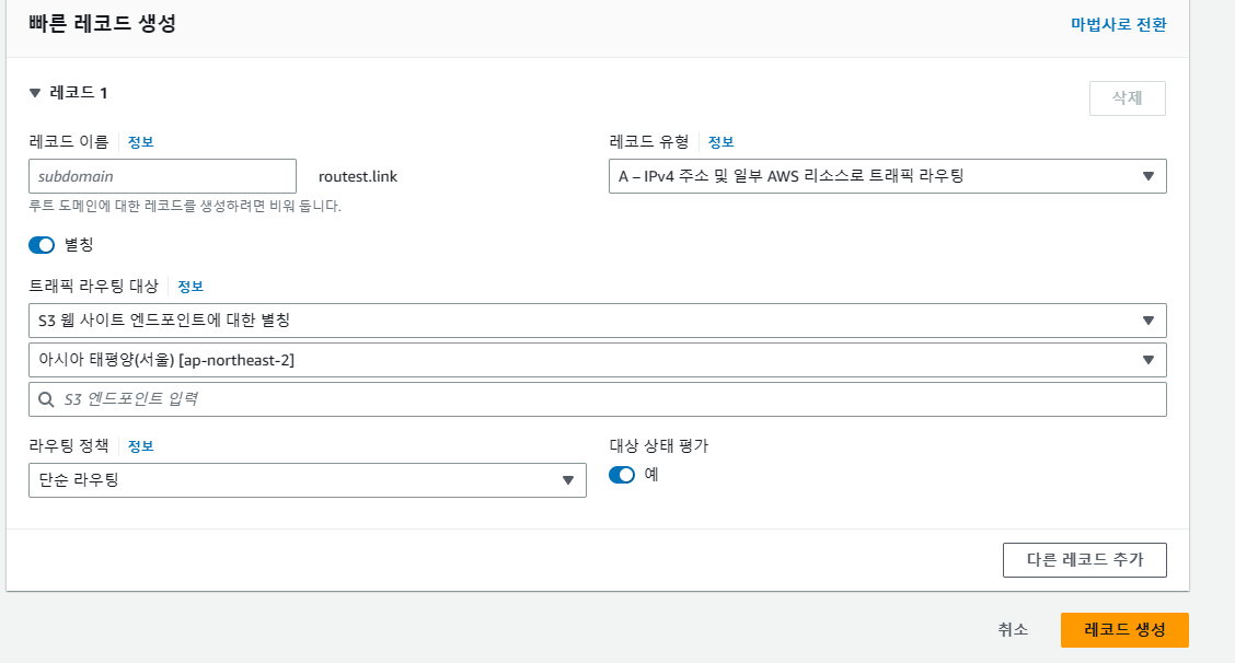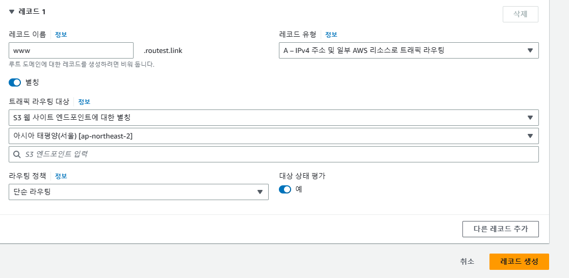 별칭 활성화 후 트래픽 라우팅 대상을 S3 웹 사이트 앤드포인트 선택 -> 버킷 생성한 리전 선택하면 자동으로 앤드포인트가 뜰꺼다. 레코드 생성 하면 끝