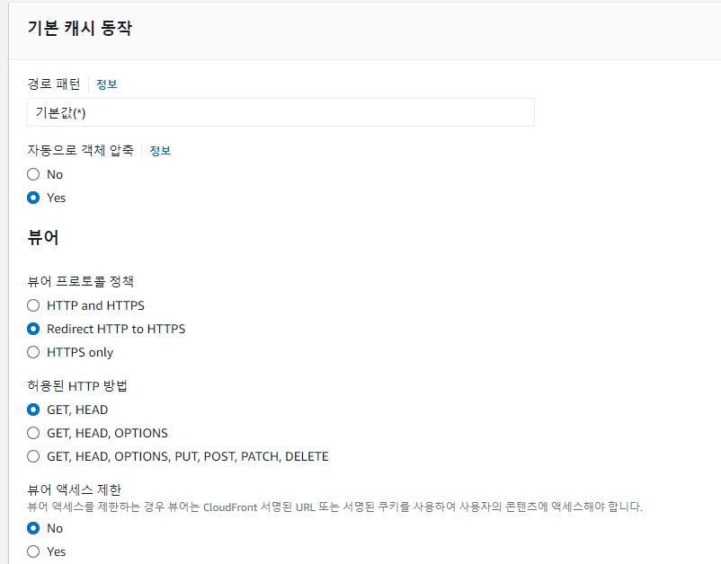 - GET, HEAD(S3 정적 배포), -GET, HEAD, OPTIONS, PUT, POST, PATCH, DELETE(서버를 배포할 때)