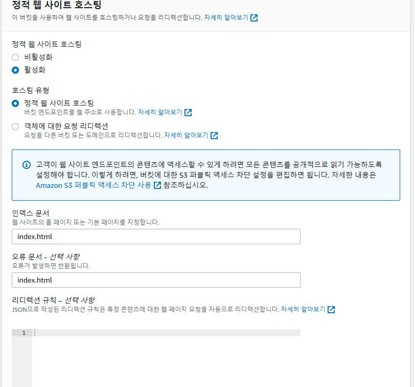 S3에서 정적웹호스팅 설정 한 후 앤드포인트url을