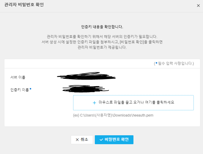6. gitbash나 puppy로 접속할려면 관리자 비밀번호가 필요하다. 생성한 서버 클릭 -> 서버 관리 및 설정 변경 에서 관리자 비밀 번호 확인 클릭 -> 발급 받은 인증키를 업로드 하면 비밀번호를 알 수 있다-> 서버로 접속 할 때 필요한 pw이다.