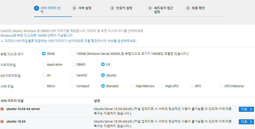 2.원하는 설정 선택 후 다음(ubuntu로 진행 할려고 한다)