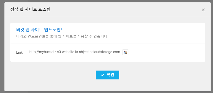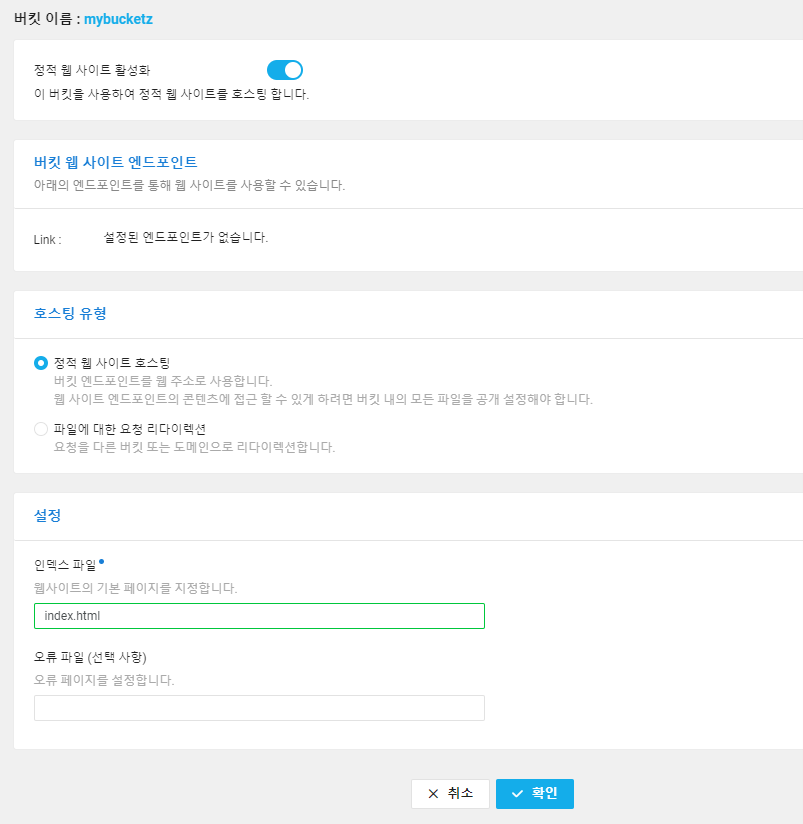 4. 활성화 후 버킷에 업로드 한 index.html 파일을 설정 후 확인 버튼을 누르면 엔드포인트가 정상적으로 뜨고 접속시 정상 작동 할 꺼다.