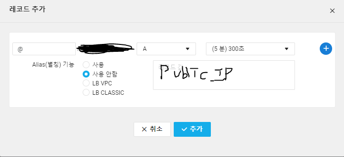 7. 그 후 global DNS 접속 후 레코드 추가 버튼 클릭 -> 아래와 같이 선택 후 레코드 값에는 퍼블릭 IP를 적고 추가 클릭->