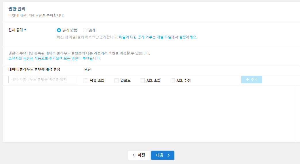 2. 버킷 생성 클릭 -> 버킷 이름 설정 -> 설정 및 암호화 관리 -> 권한 관리 -> 최종 확인 후 생성 하면 된다.