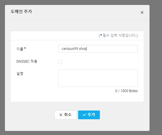 4. 접속 후 도메인 추가 버튼 클릭 -> 이름에 구매한 도메인을 적고 추가 버튼 클릭